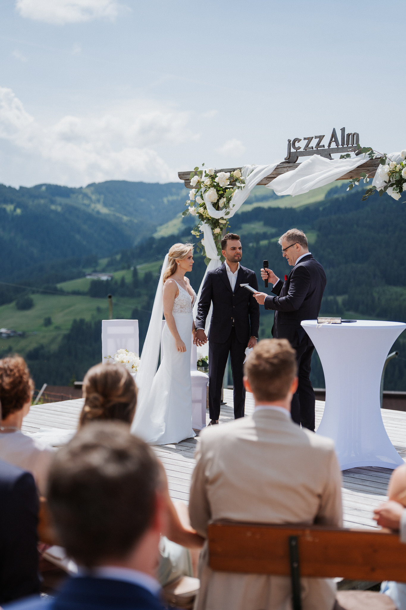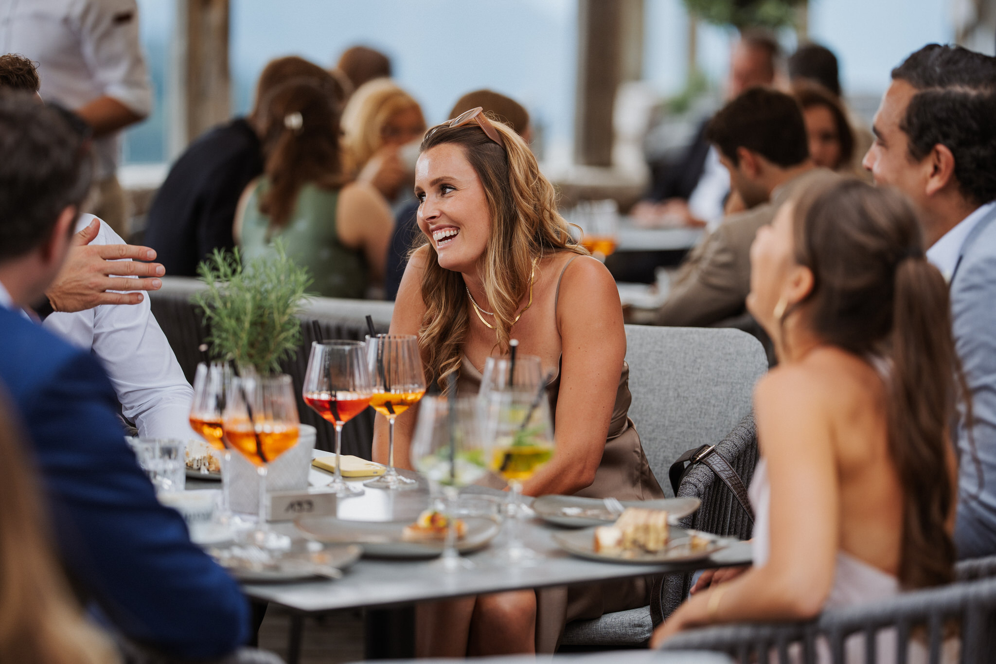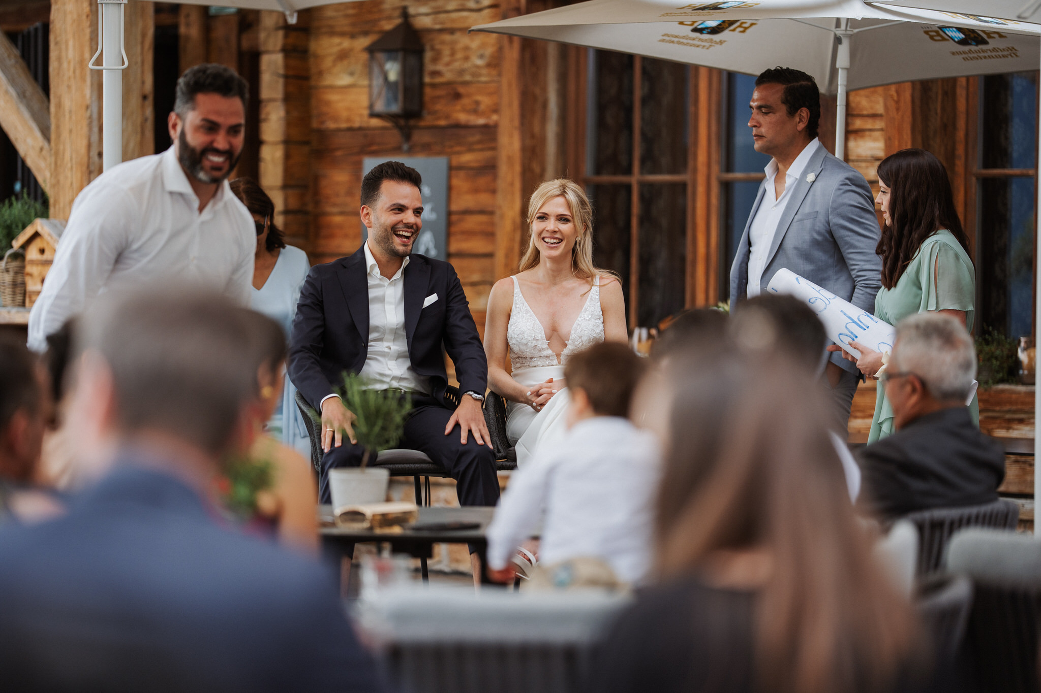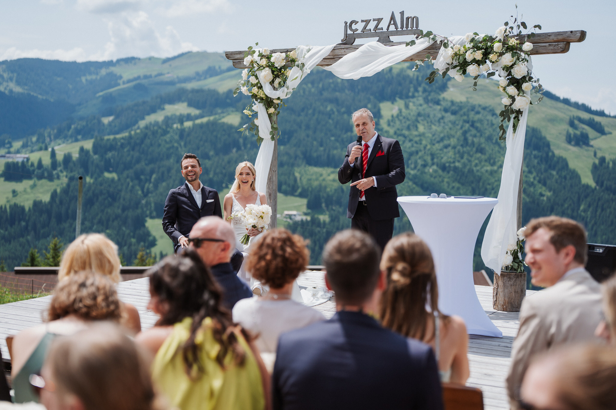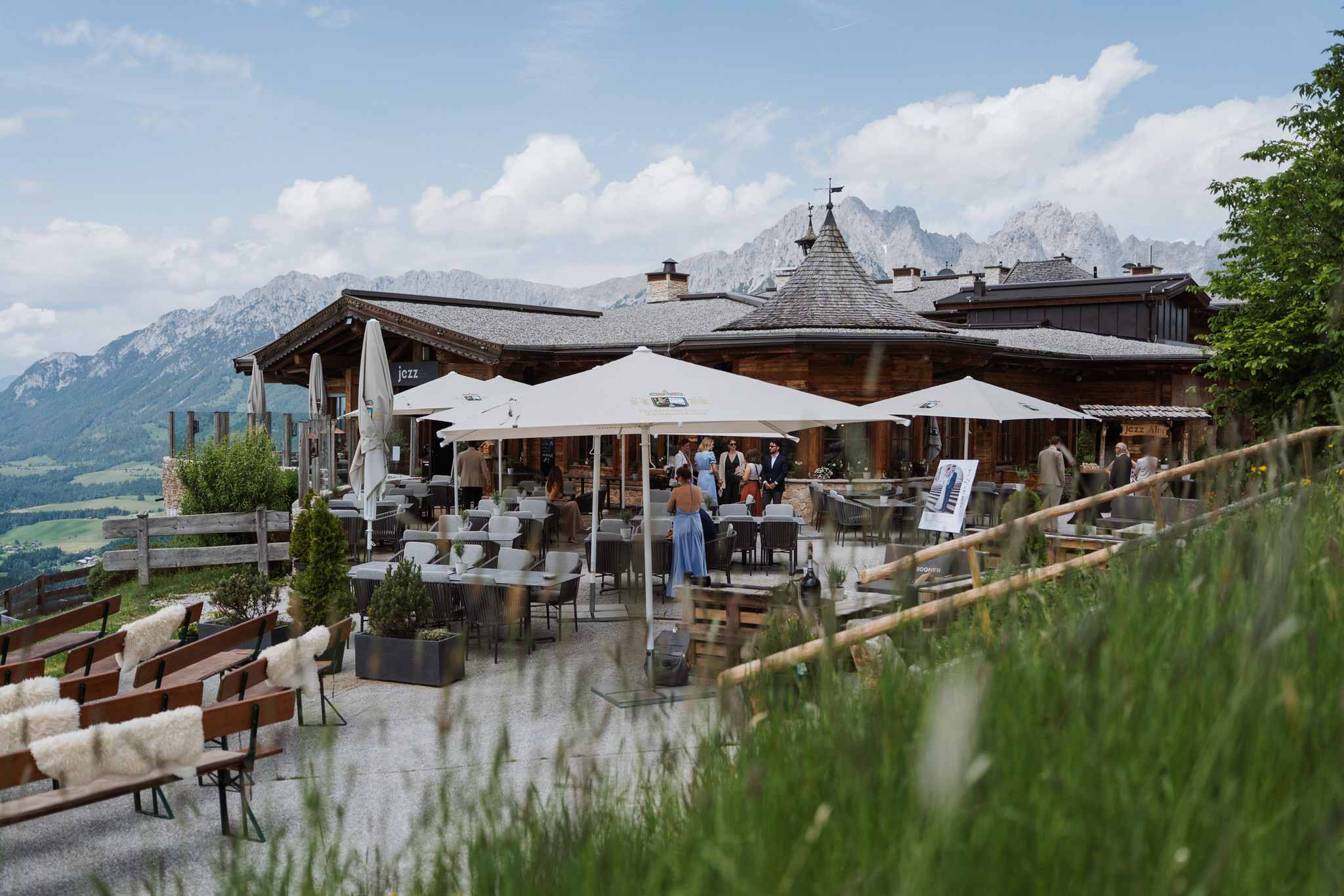 Die freie Trauung auf der Terrasse war persönlich, emotional und liebevoll gestaltet – ein Moment, der nicht nur das Brautpaar, sondern auch alle Gäste tief berührte. Anschließend wurde auf der Sonnenterrasse gratuliert, angestoßen und natürlich gefeiert. Bei Drinks, Hochzeitstorte und viel Lachen genossen alle den herrlichen Nachmittag mit Blick auf die Tiroler Bergwelt.