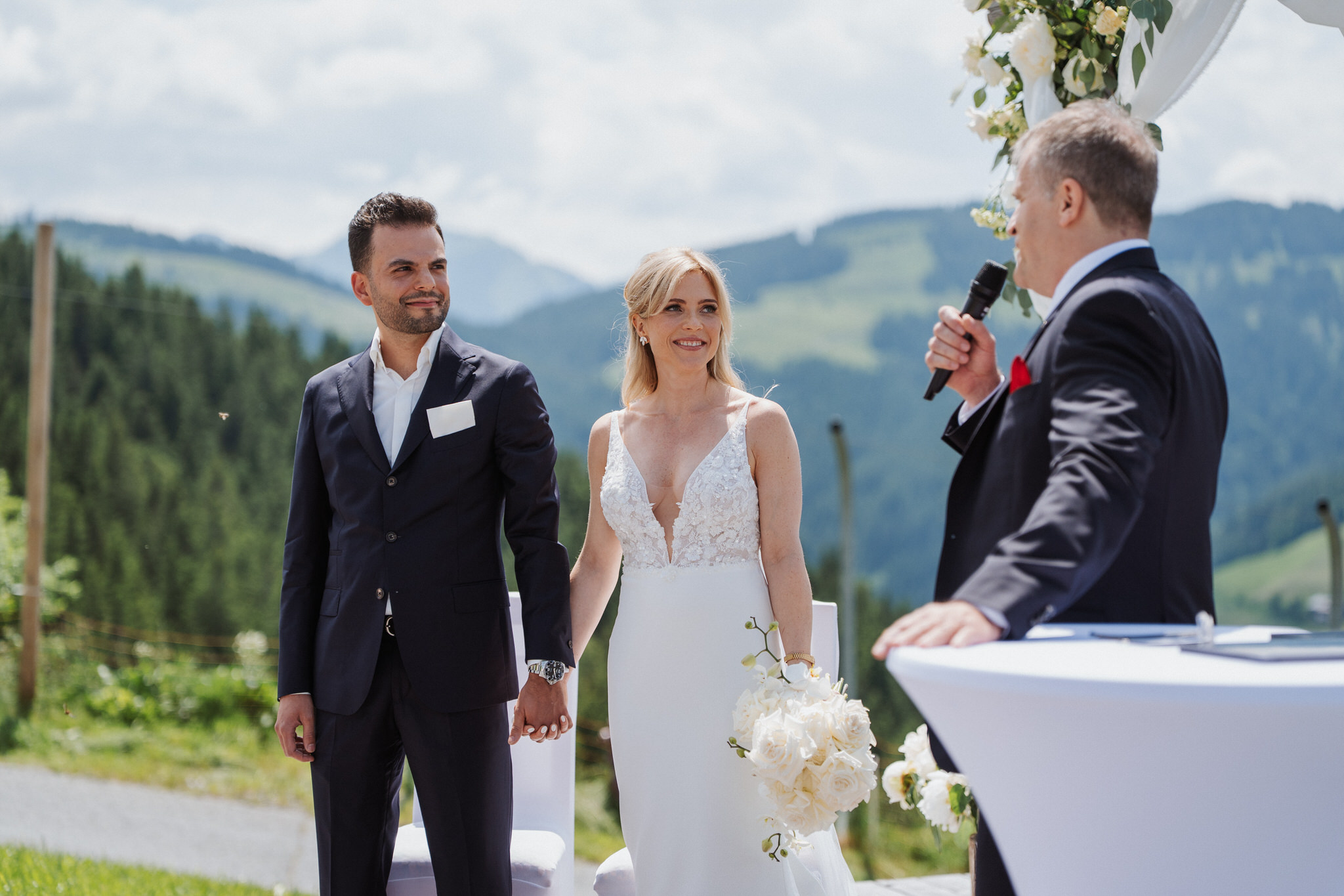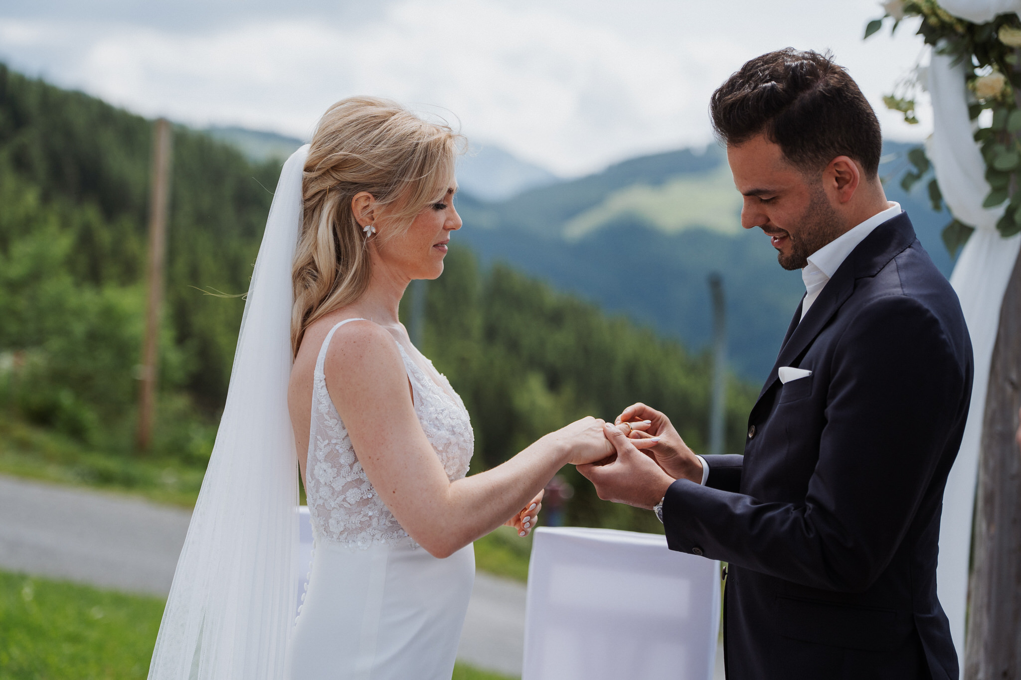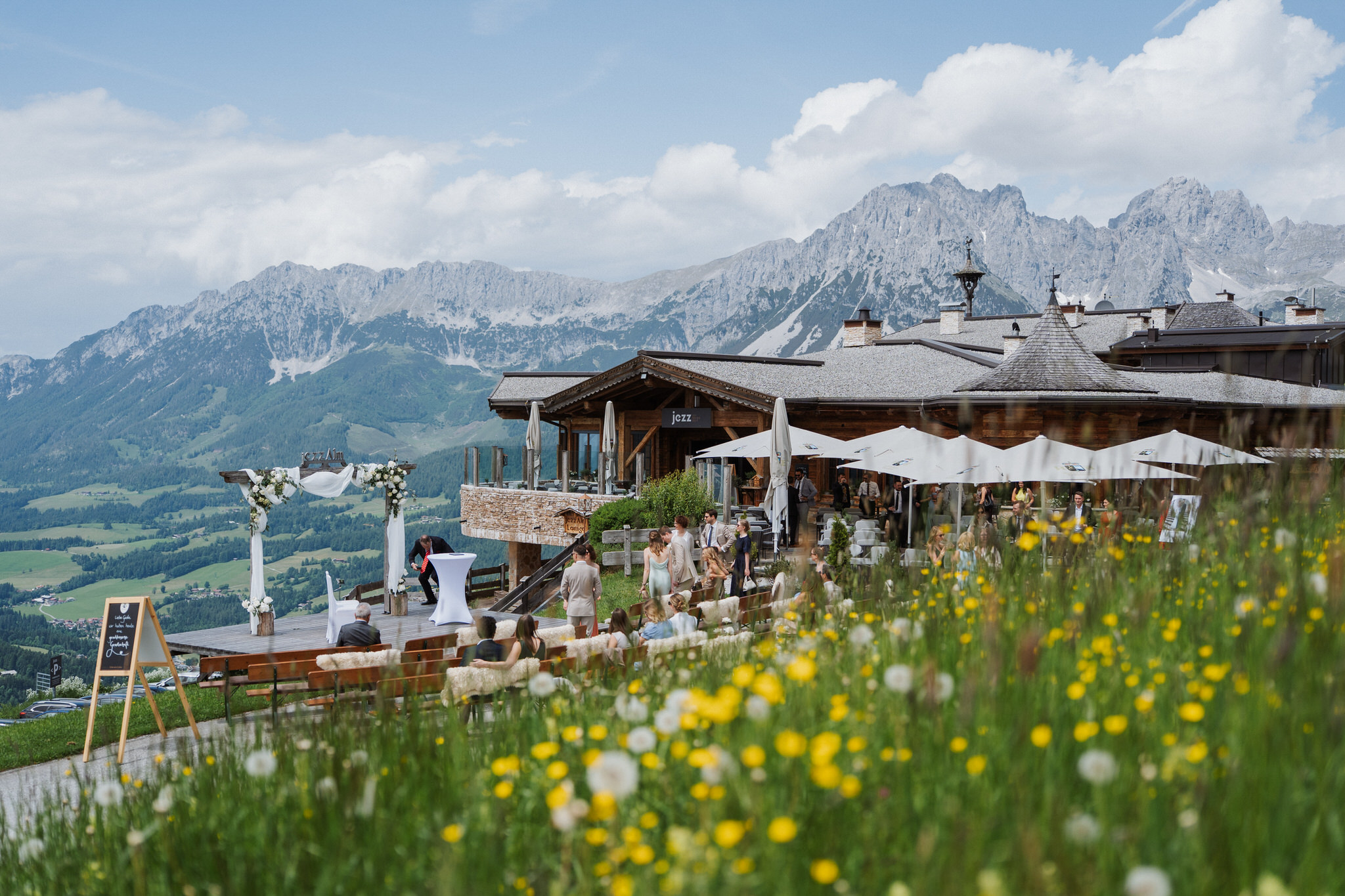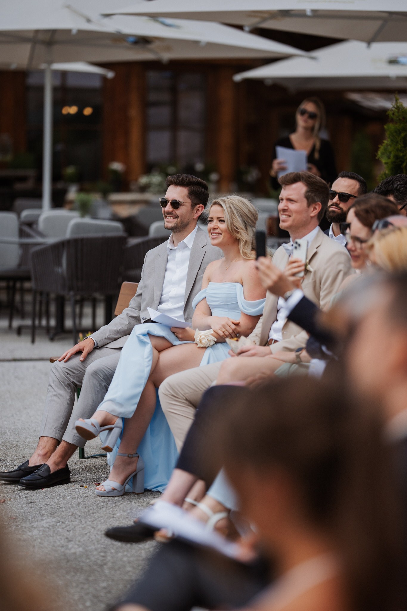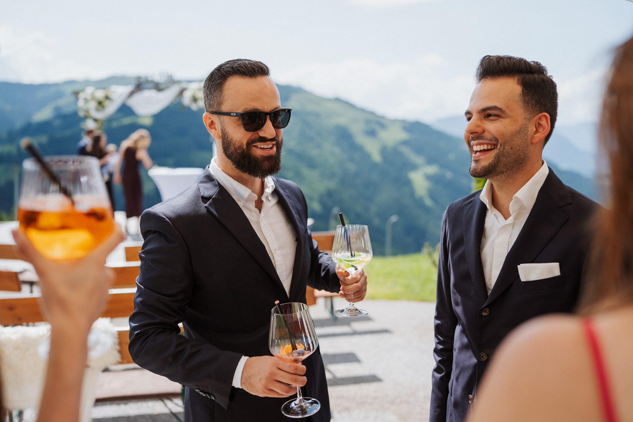 Die freie Trauung auf der Terrasse war persönlich, emotional und liebevoll gestaltet – ein Moment, der nicht nur das Brautpaar, sondern auch alle Gäste tief berührte. Anschließend wurde auf der Sonnenterrasse gratuliert, angestoßen und natürlich gefeiert. Bei Drinks, Hochzeitstorte und viel Lachen genossen alle den herrlichen Nachmittag mit Blick auf die Tiroler Bergwelt.