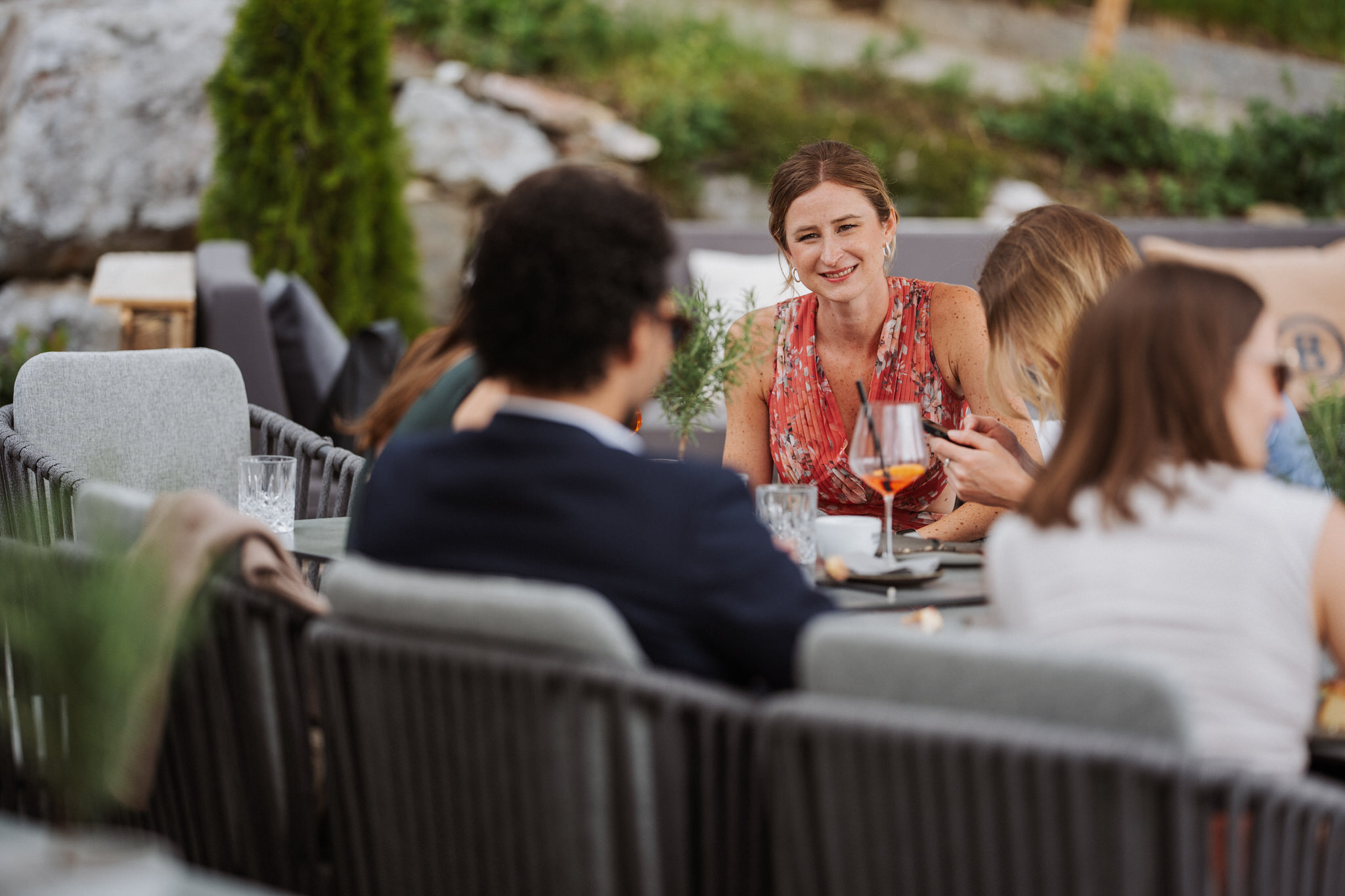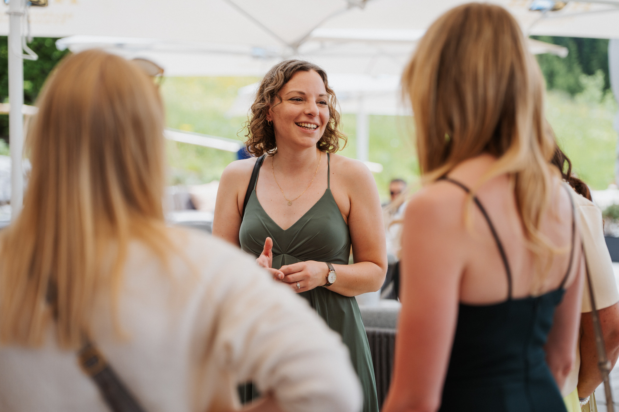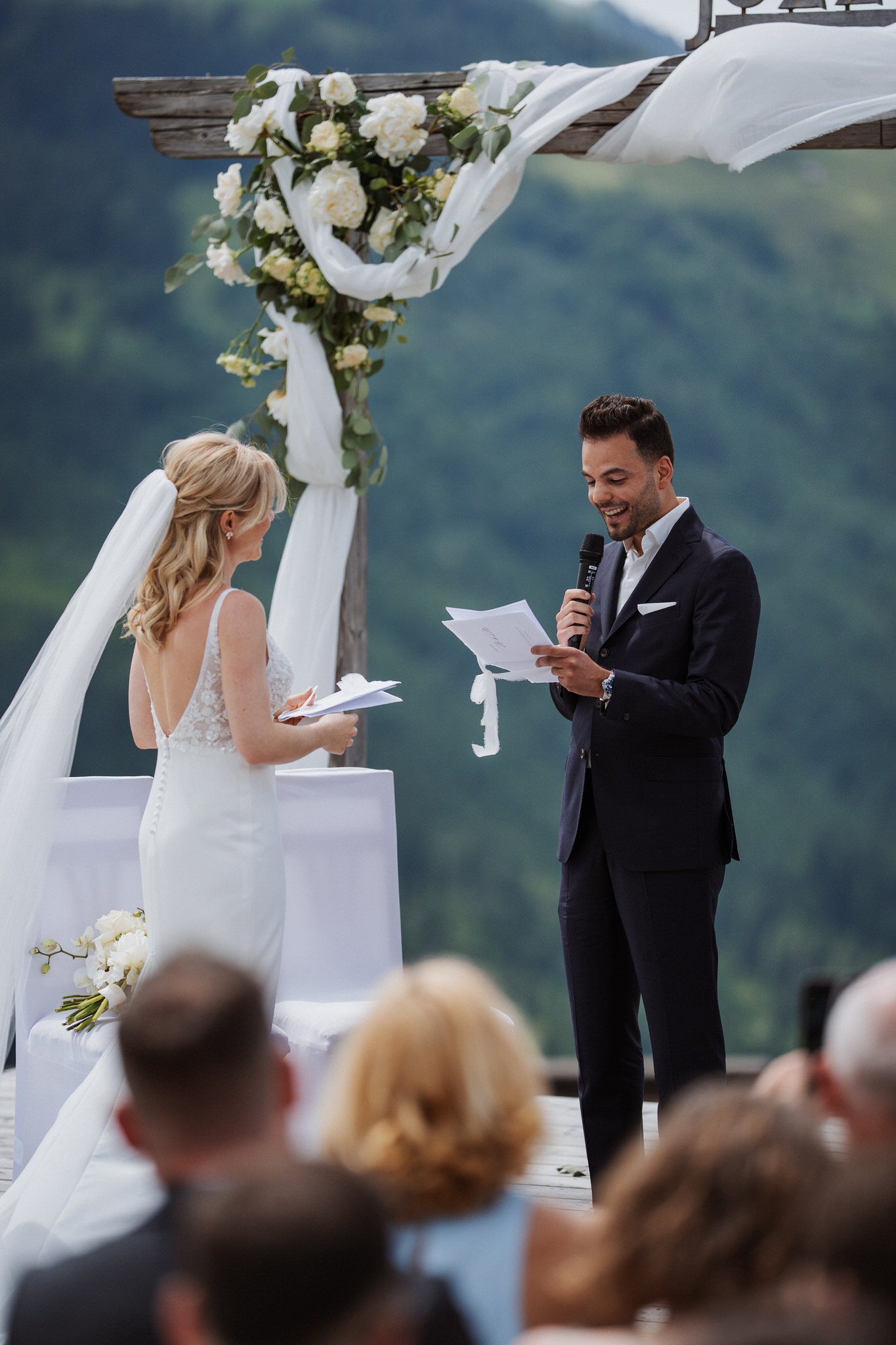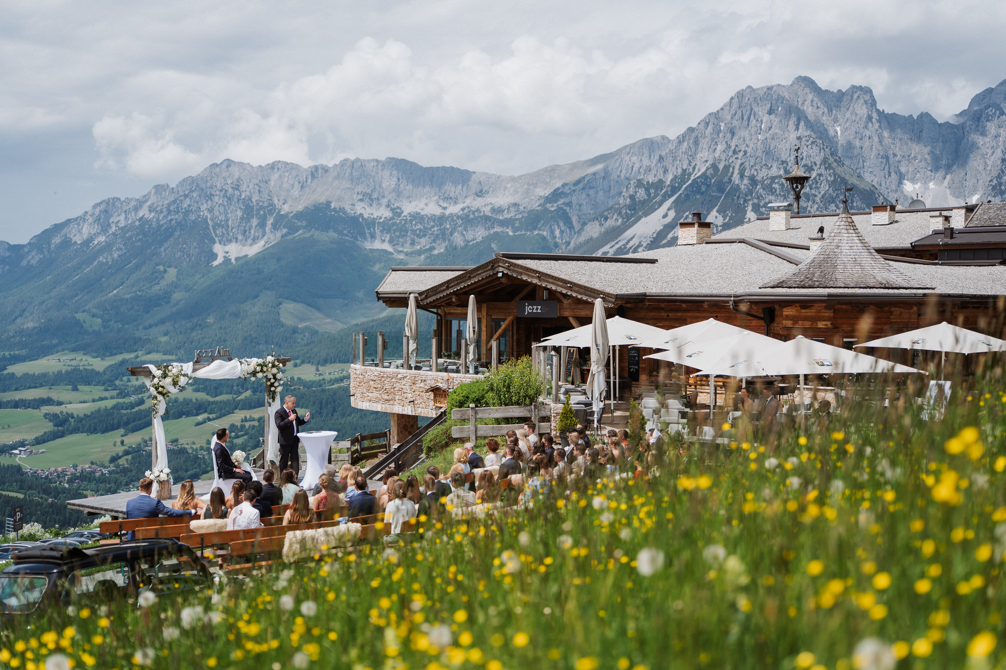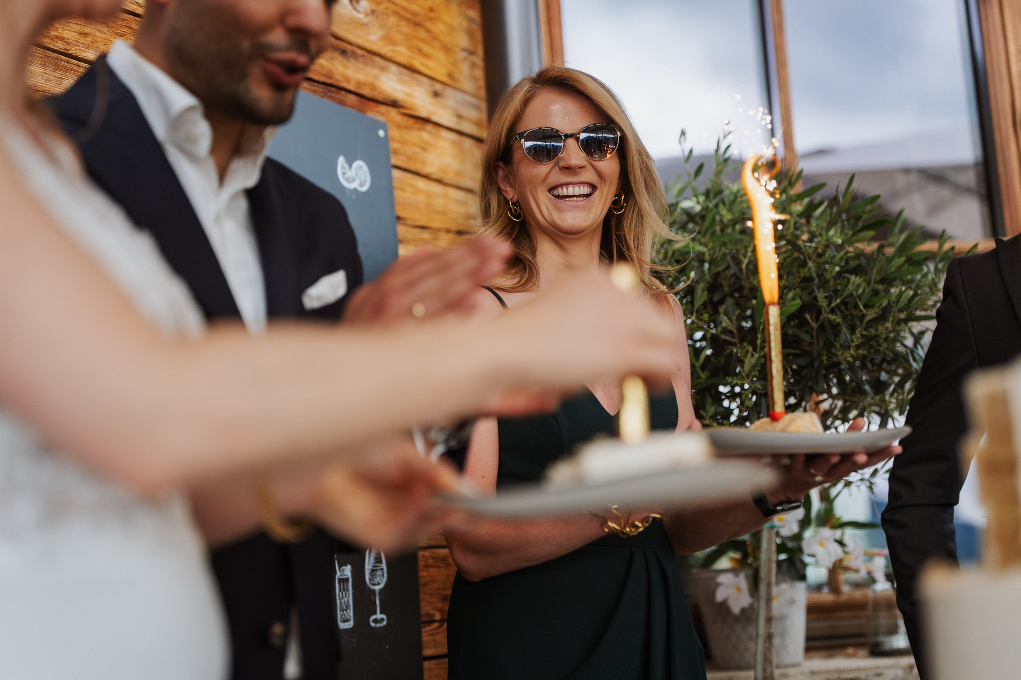 Die freie Trauung auf der Terrasse war persönlich, emotional und liebevoll gestaltet – ein Moment, der nicht nur das Brautpaar, sondern auch alle Gäste tief berührte. Anschließend wurde auf der Sonnenterrasse gratuliert, angestoßen und natürlich gefeiert. Bei Drinks, Hochzeitstorte und viel Lachen genossen alle den herrlichen Nachmittag mit Blick auf die Tiroler Bergwelt.