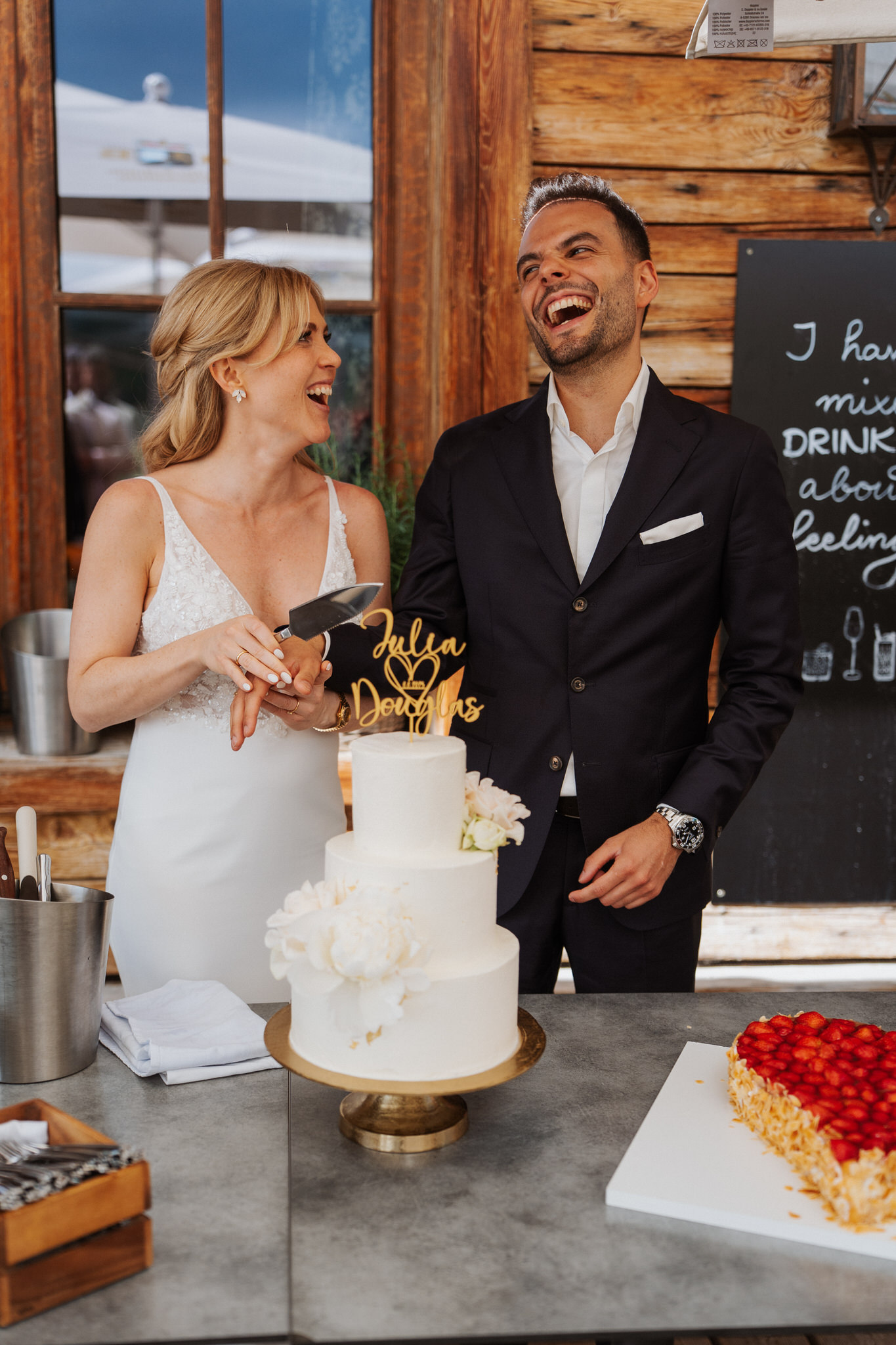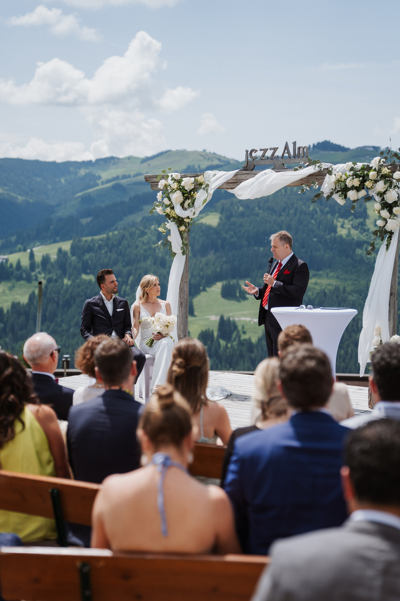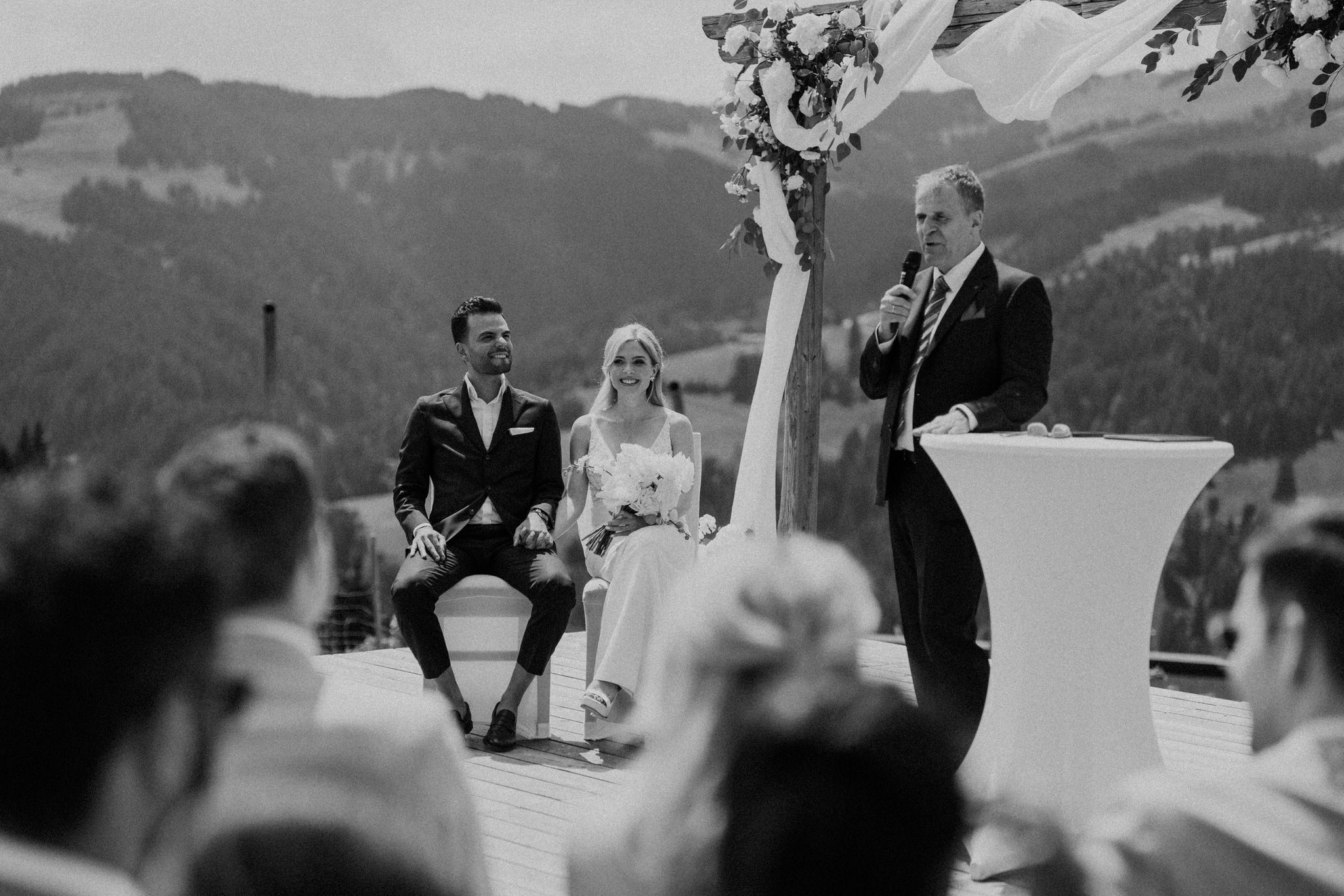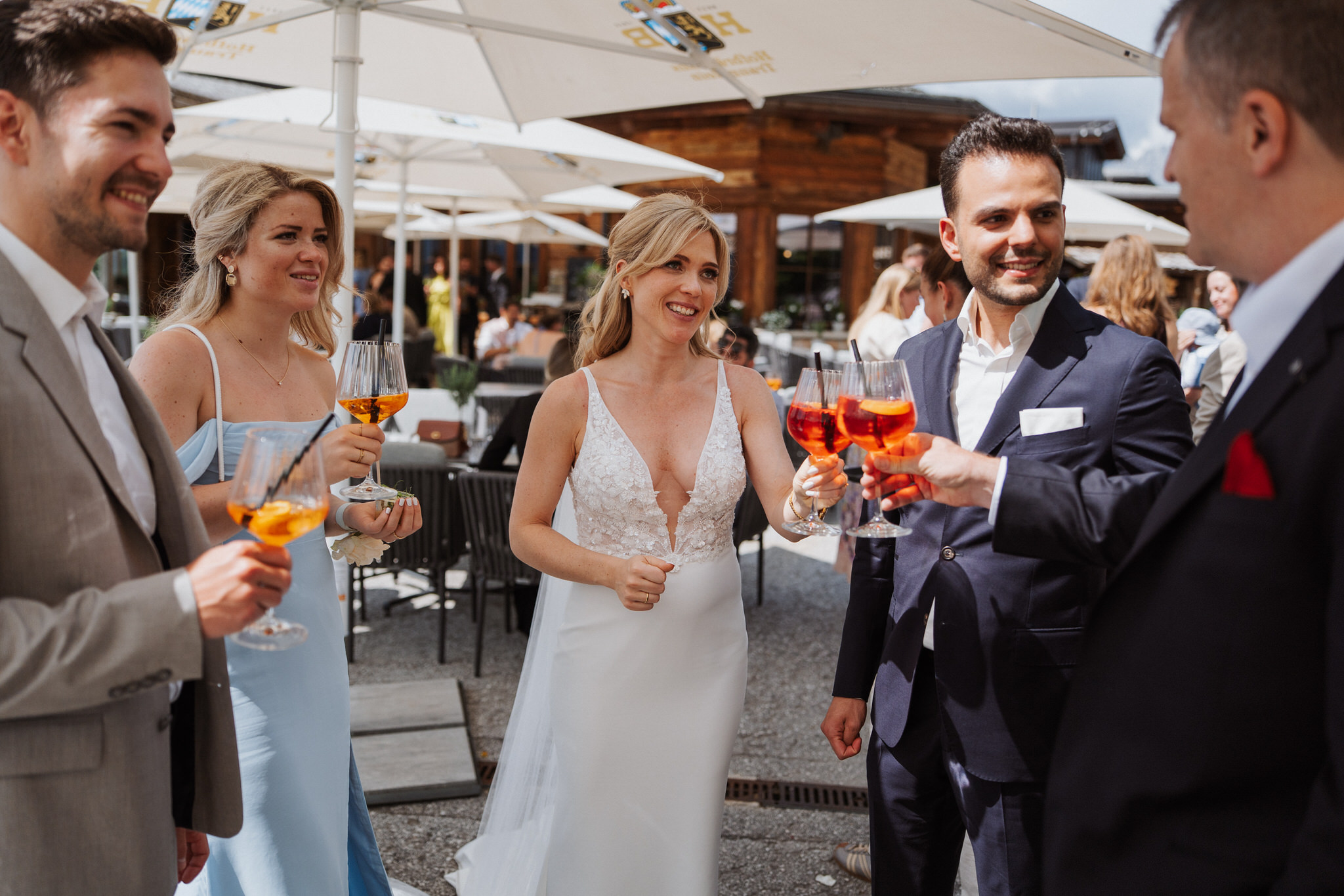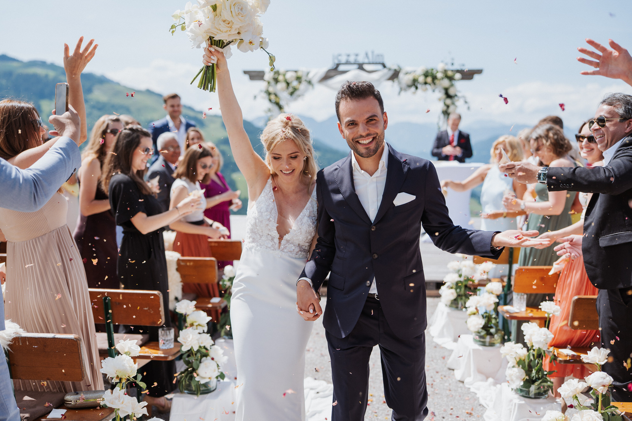 Die freie Trauung auf der Terrasse war persönlich, emotional und liebevoll gestaltet – ein Moment, der nicht nur das Brautpaar, sondern auch alle Gäste tief berührte. Anschließend wurde auf der Sonnenterrasse gratuliert, angestoßen und natürlich gefeiert. Bei Drinks, Hochzeitstorte und viel Lachen genossen alle den herrlichen Nachmittag mit Blick auf die Tiroler Bergwelt.