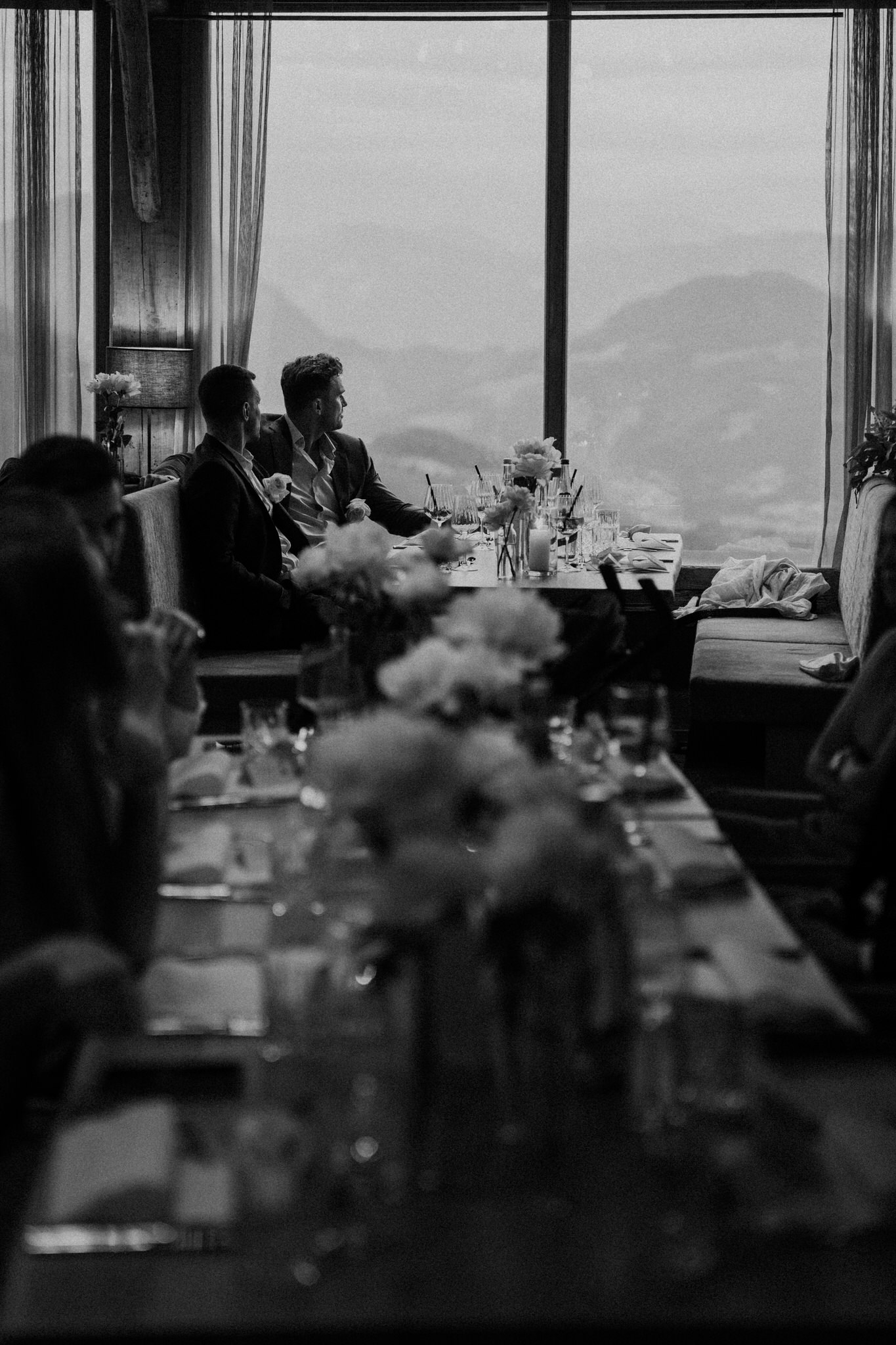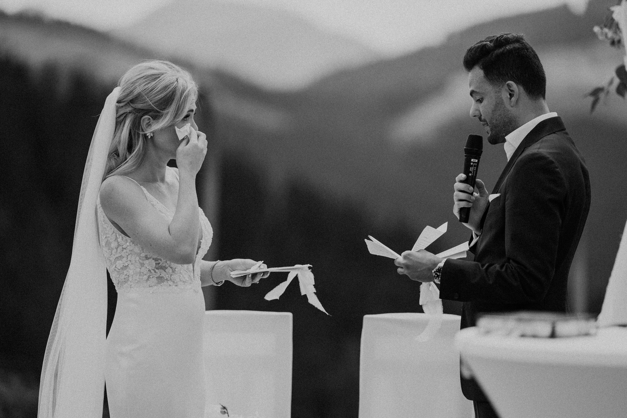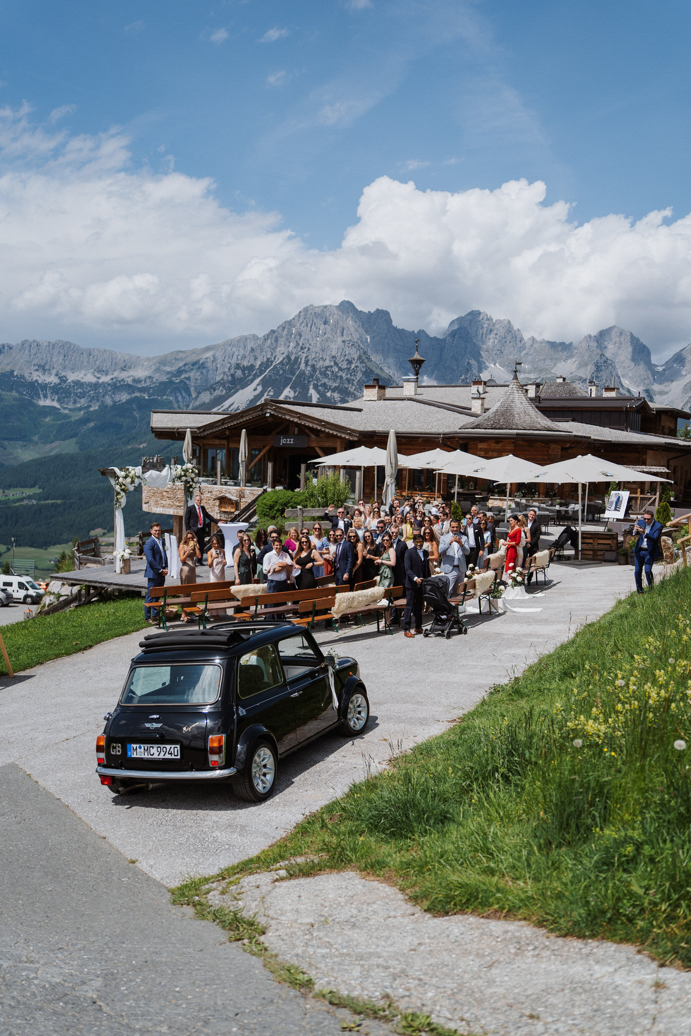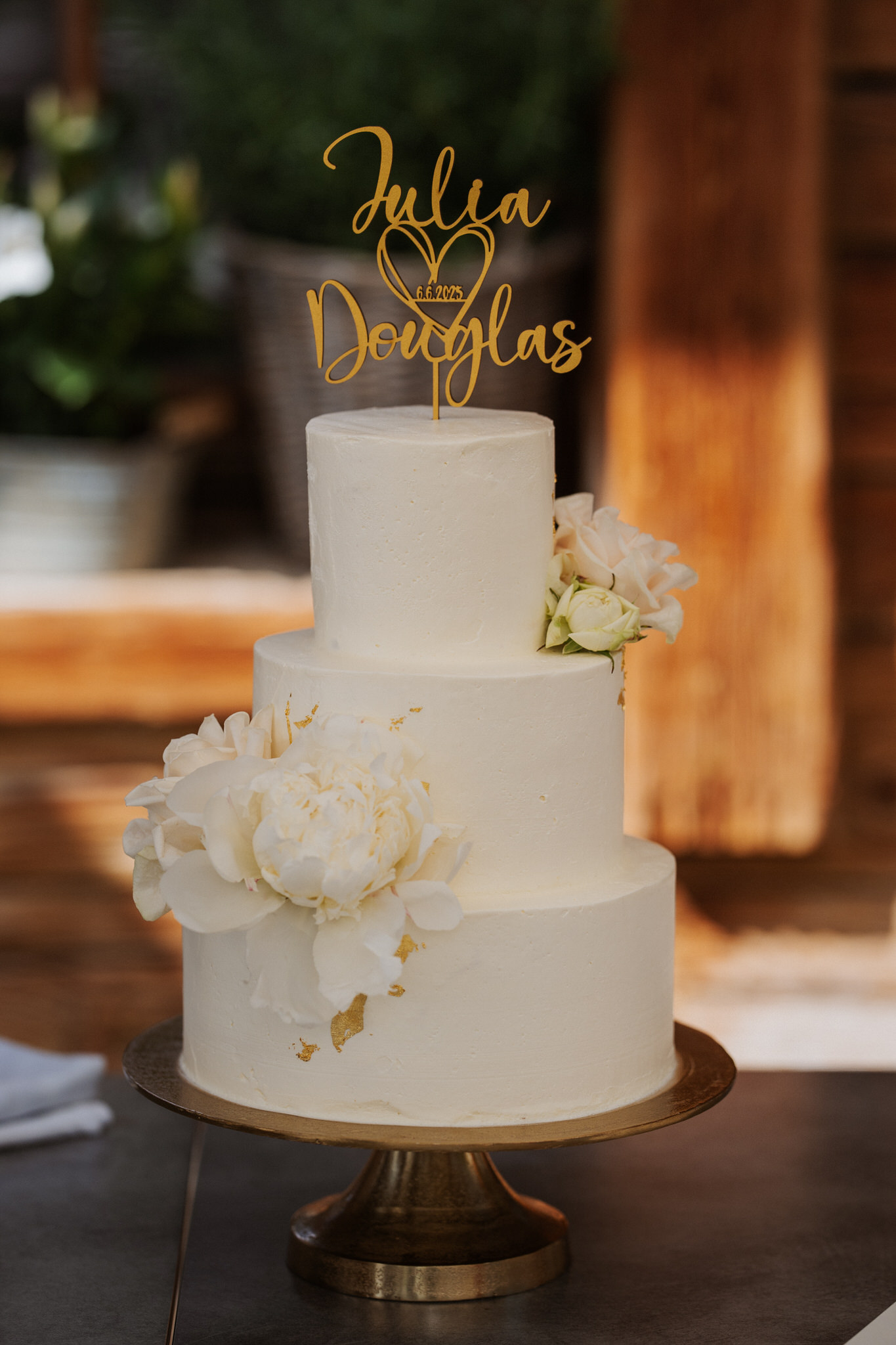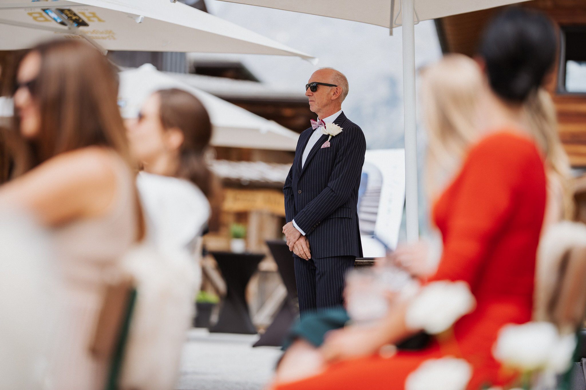 Die freie Trauung auf der Terrasse war persönlich, emotional und liebevoll gestaltet – ein Moment, der nicht nur das Brautpaar, sondern auch alle Gäste tief berührte. Anschließend wurde auf der Sonnenterrasse gratuliert, angestoßen und natürlich gefeiert. Bei Drinks, Hochzeitstorte und viel Lachen genossen alle den herrlichen Nachmittag mit Blick auf die Tiroler Bergwelt.